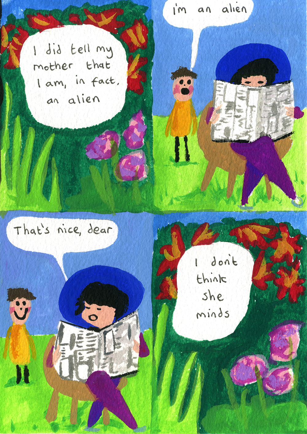 An Alien Who is Also a Mum is a 16 page comic about parenting small children whilst also being a collection of alien parasites living in the body of a human woman.